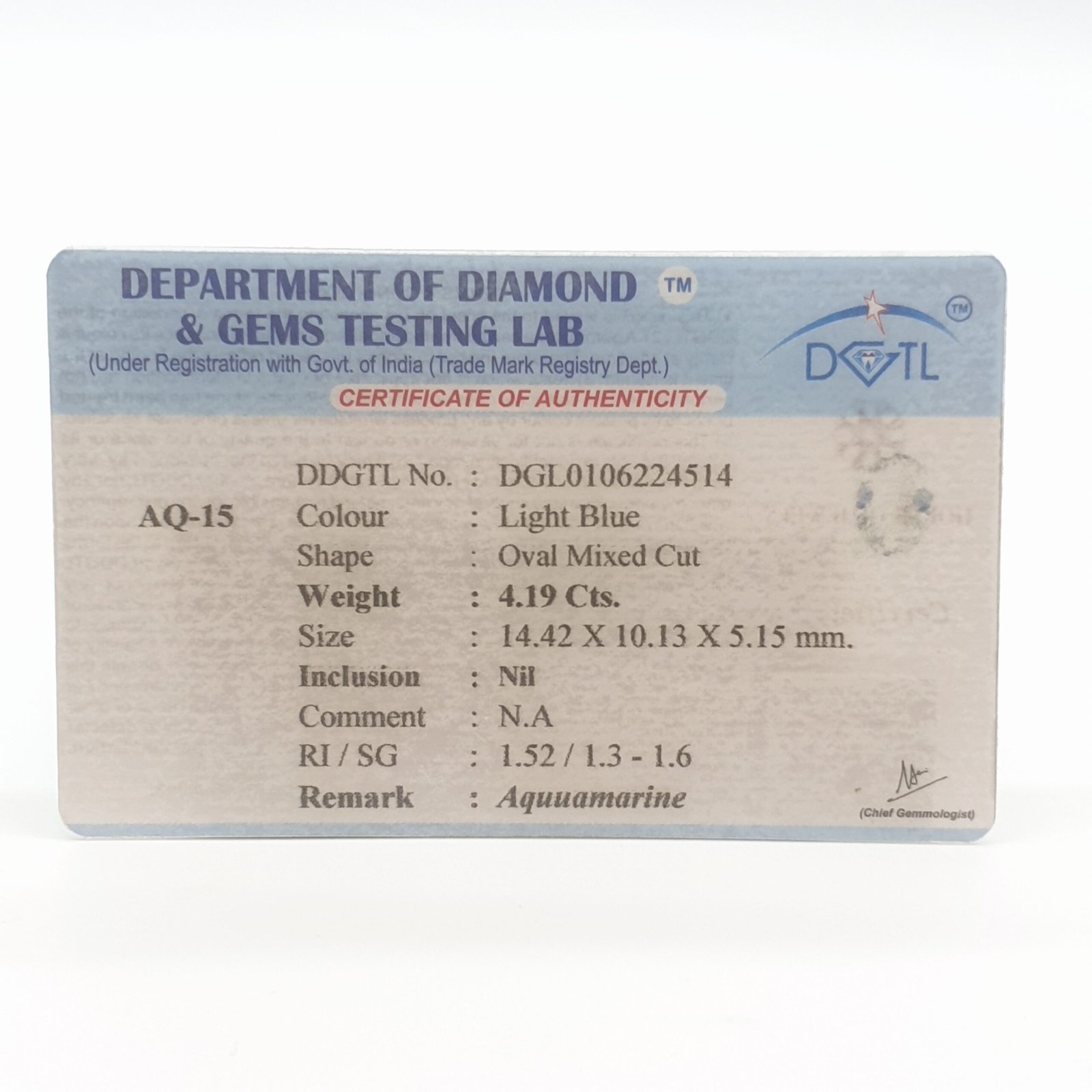 Natural Aquamarine, certified by DDGTL. Contact us for further Certification by GIA / GII / IGI and Others.