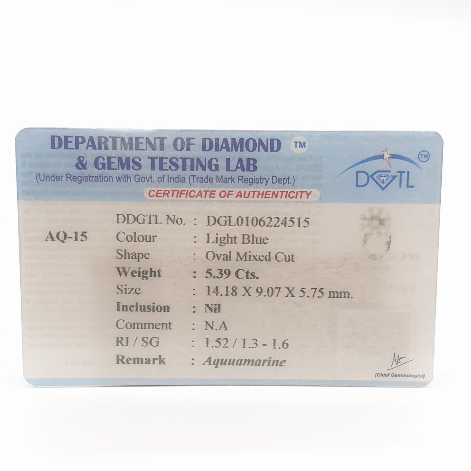 Natural Aquamarine, certified by DDGTL. Contact us for further Certification by GIA / GII / IGI and Others.