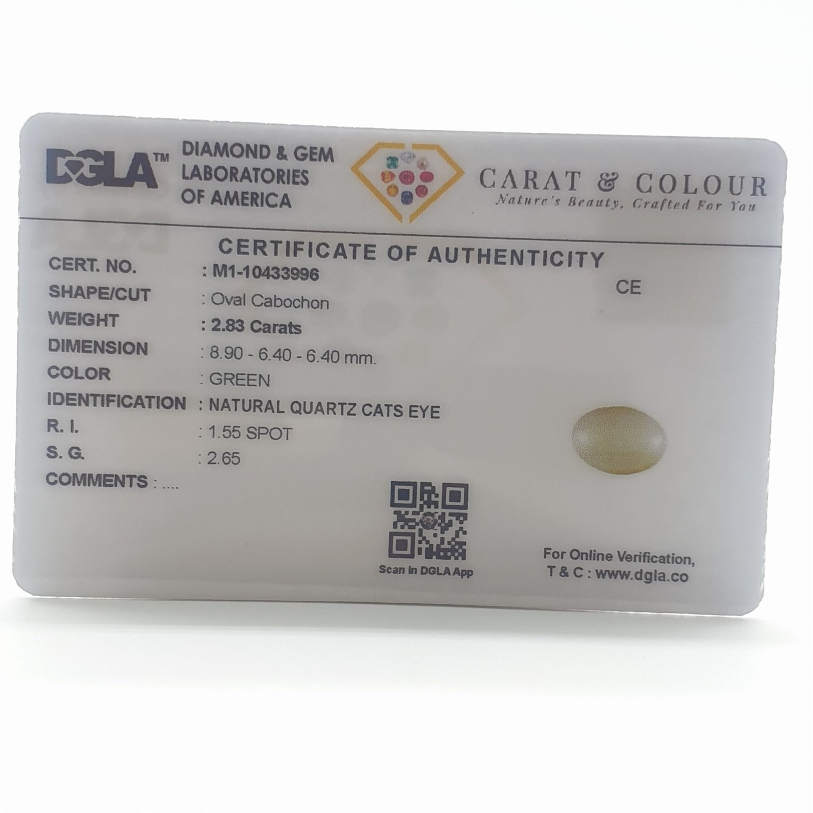 Natural Untreated Cat’s Eye, certified by DGLA. Contact us for further Certification by GIA / GII / IGI and Others.