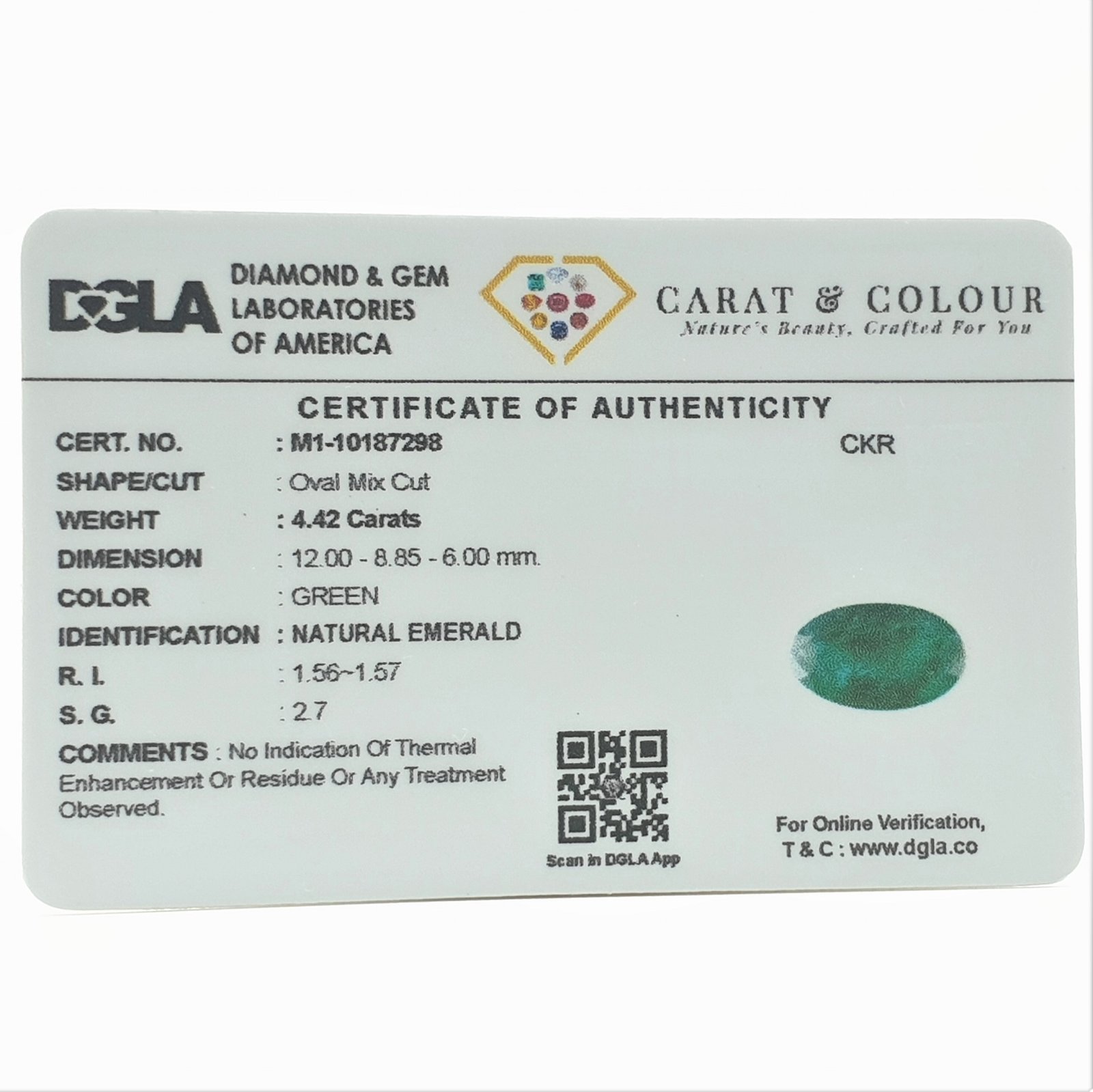 Natural Untreated Zambian Emerald, certified by DGLA. Contact us for further Certification by GIA / GII / IGI and Others.