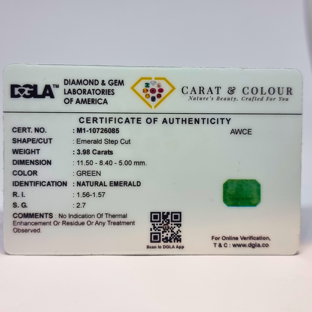 Natural Untreated Zambian Emerald, certified by DGLA. Contact us for further Certification by GIA / GII / IGI and Others (Charges as at Actuals). Get Lifetime Buyback policy with any gemstone purchased from Carat and Colour.