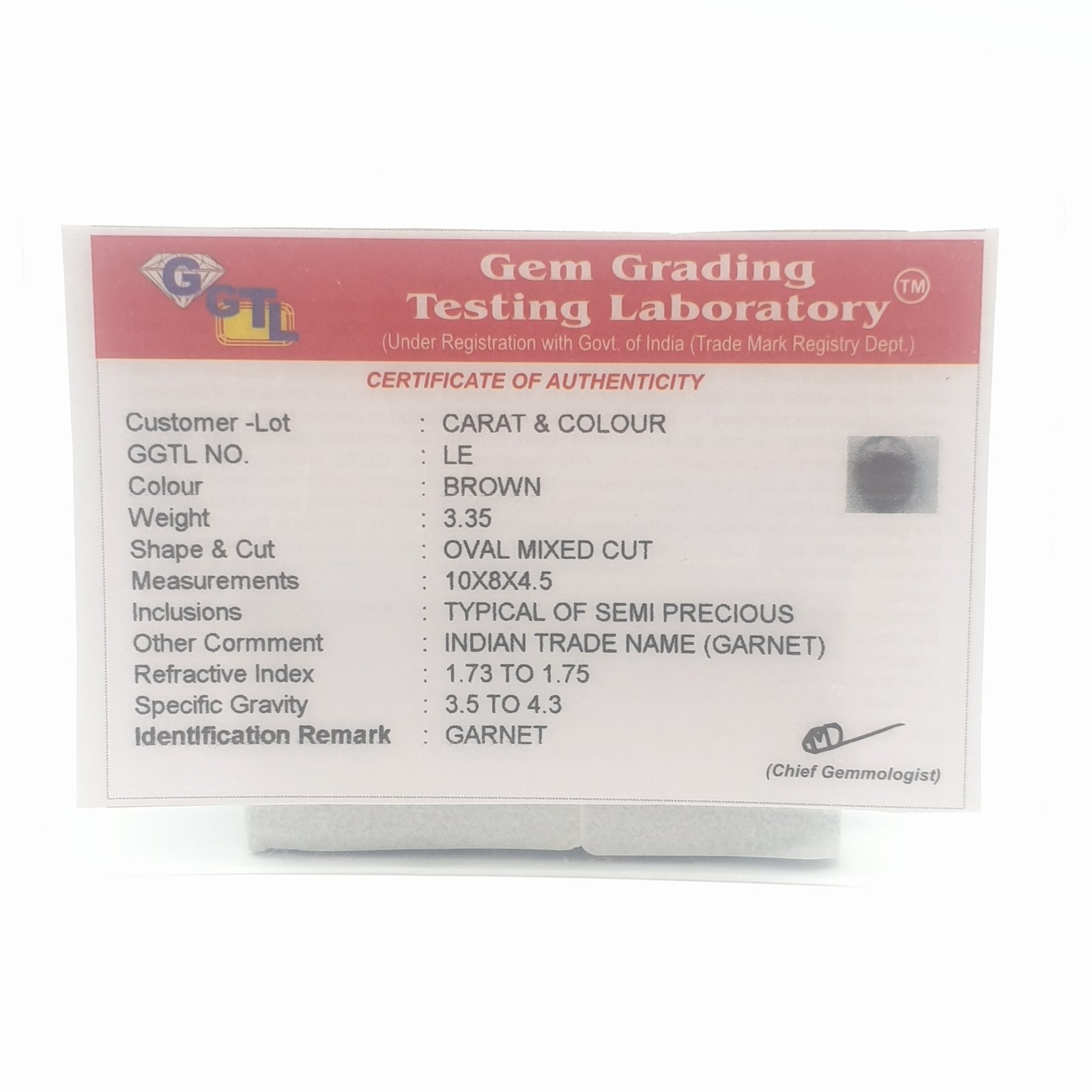 Natural Untreated Garnet, certified by DGLA. Contact us for further Certification by GIA / GII / IGI and Others.