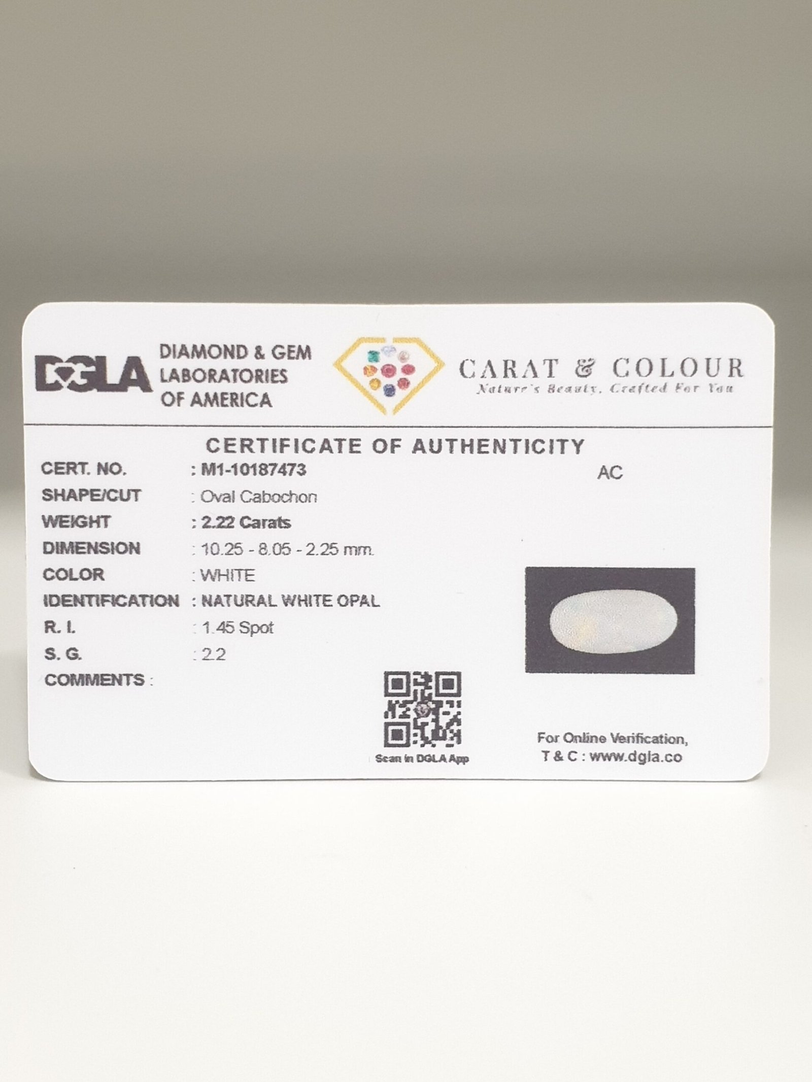 Natural Untreated Autralian White Opal, certified by DGLA. Contact us for further Certification by GIA / GII / IGI and Others.