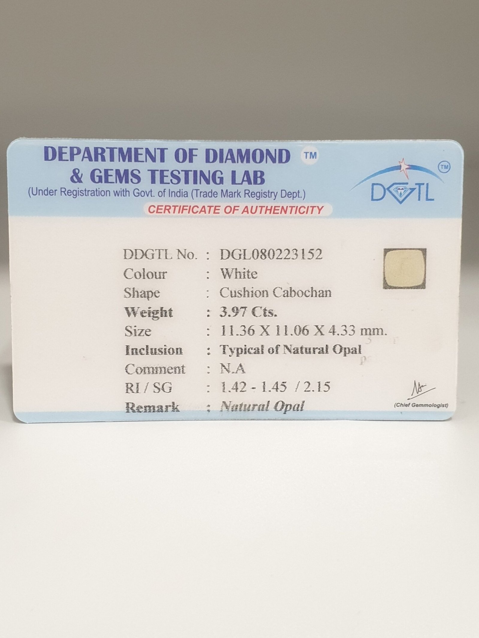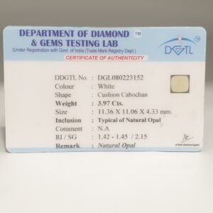 Natural Untreated Autralian White Opal, certified by DDGTL. Contact us for further Certification by GIA / GII / IGI and Others.