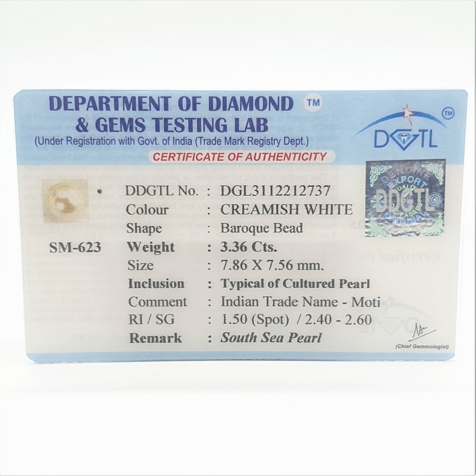 Natural Cultured Pearl (Moti) from South Sea China, certified by DDGTL. Contact us for further Certification by GIA / GII / IGI and Others.