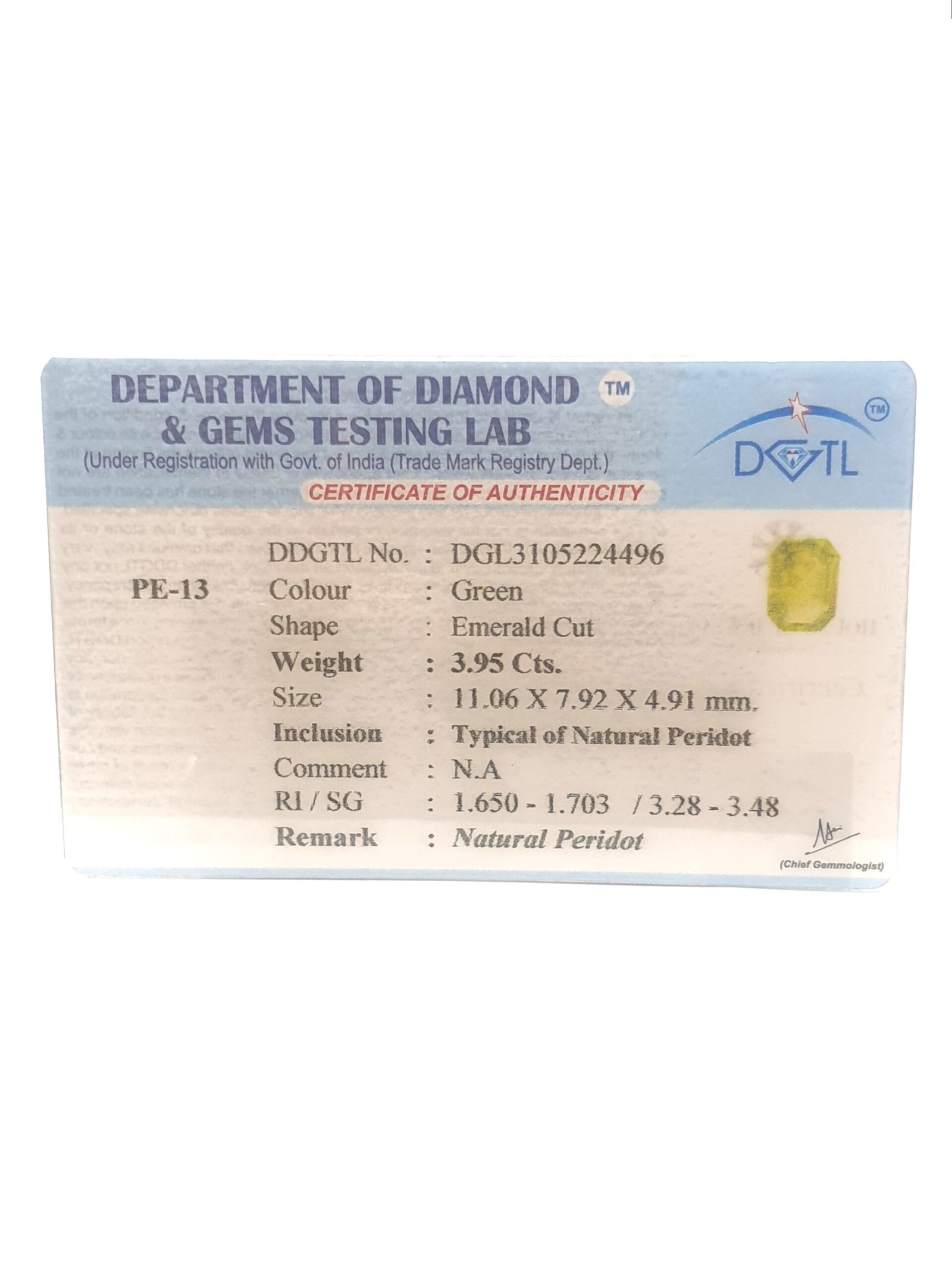 Natural Peridot, certified by DDGTL. Contact us for further Certification by GIA / GII / IGI and Others.