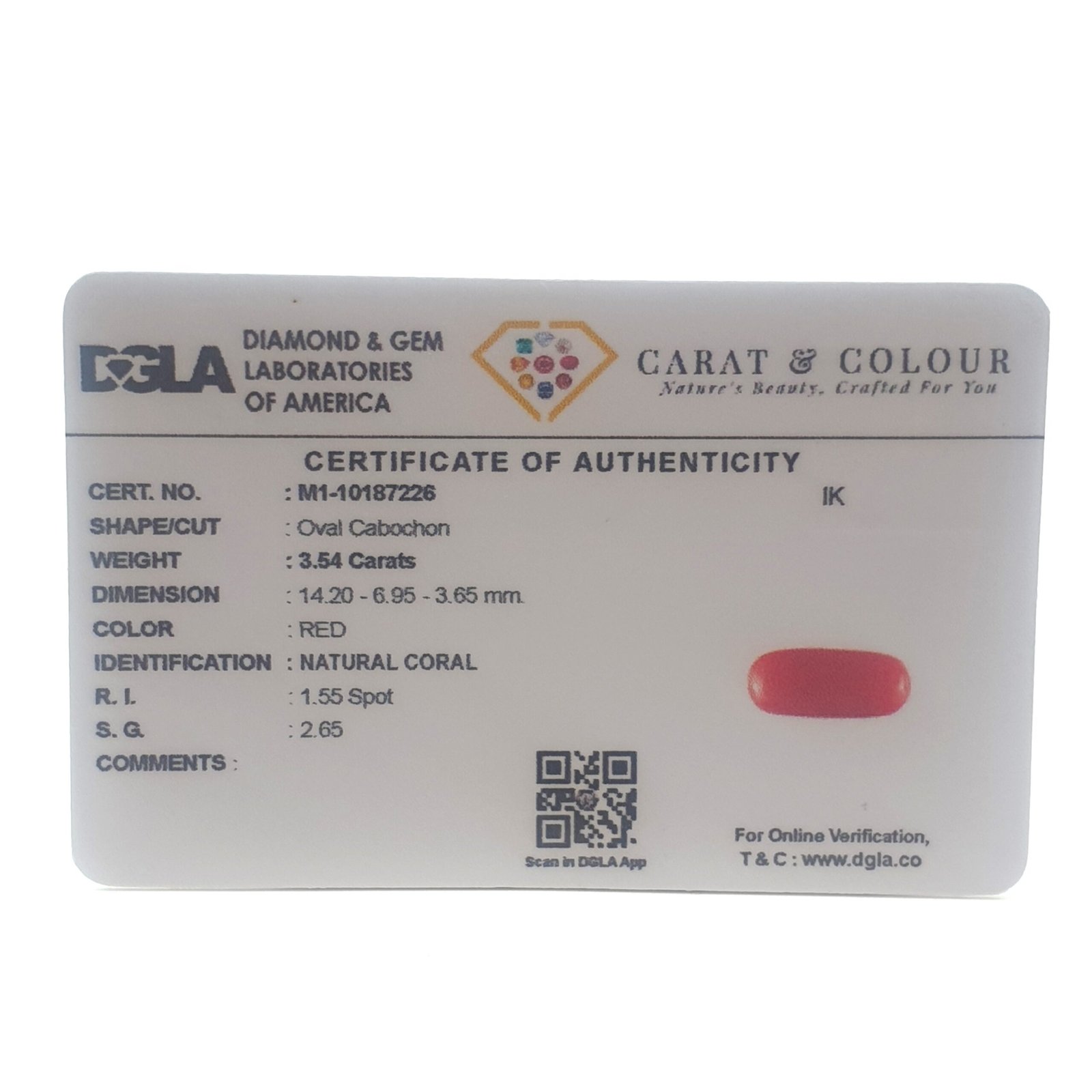 Natural Untreated Red Coral (Munga), certified by DGLA. Contact us for further Certification by GIA / GII / IGI and Others.