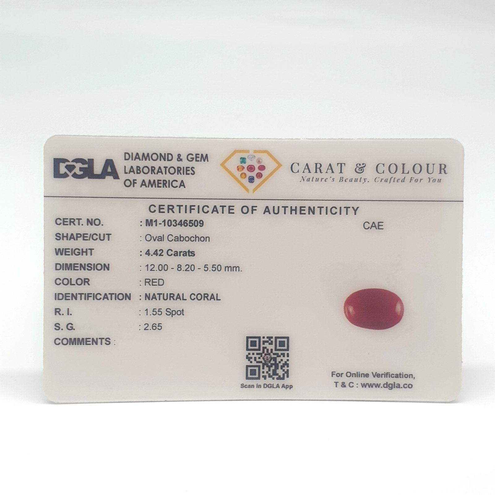 Natural Untreated Red Coral (Munga), certified by DGLA. Contact us for further Certification by GIA / GII / IGI and Others.