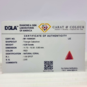 Natural Untreated Red Coral ( Italian ) , certified by DGLA. Contact us for further Certification by GIA / GII / IGI and Others (Charges as at Actuals). Get Lifetime Buyback policy with any gemstone purchased from Carat and Colour.