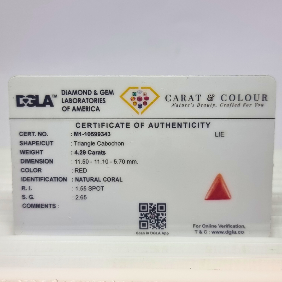 Natural Untreated Red Coral ( Italian ) , certified by DGLA. Contact us for further Certification by GIA / GII / IGI and Others (Charges as at Actuals). Get Lifetime Buyback policy with any gemstone purchased from Carat and Colour.