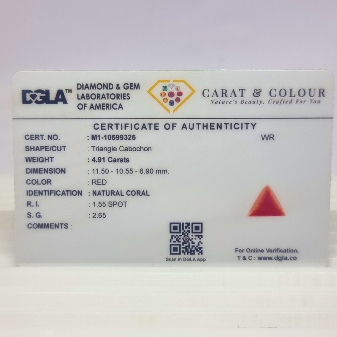 Natural Untreated Red Coral ( Italian ) , certified by DGLA. Contact us for further Certification by GIA / GII / IGI and Others (Charges as at Actuals). Get Lifetime Buyback policy with any gemstone purchased from Carat and Colour.
