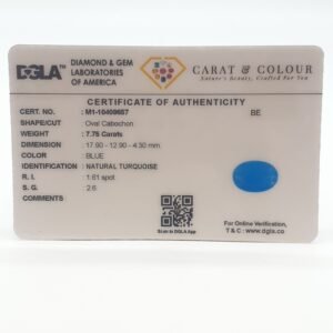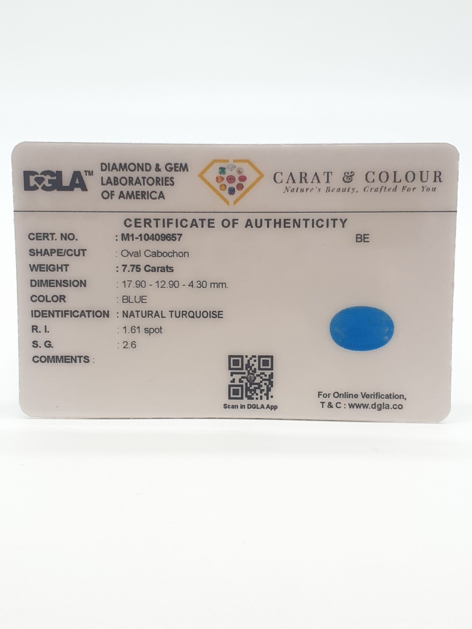 Natural Untreated Turquoise (Firoza) from Arizona, certified by DGLA. Contact us for further Certification by GIA / GII / IGI and Others.